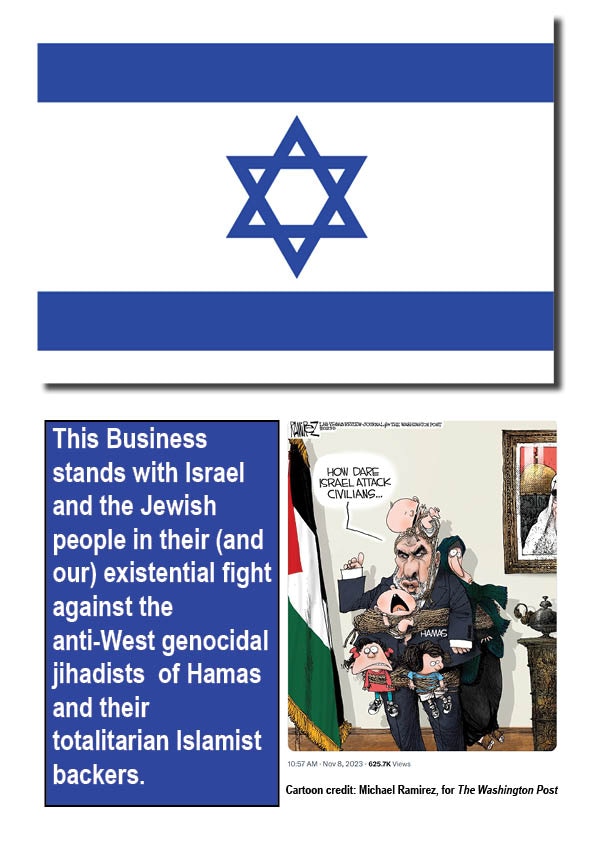 Above . Are you unsure why this business supports Israel in its war against Islamism and what that war has to do with us? Four YouTube videos to check out: Douglas Murray on The Caroline Glick Show 13 Nov 2023, Bill Maher on Real Time 16 Dec 2023, The Left’s Long War on Israel 12 Oct 2023, and “Bari Weiss: Why DEI Must End For Good” for The Free Press on YouTube 19 Dec 2023. Below are some notes from the Bar Weiss video:-