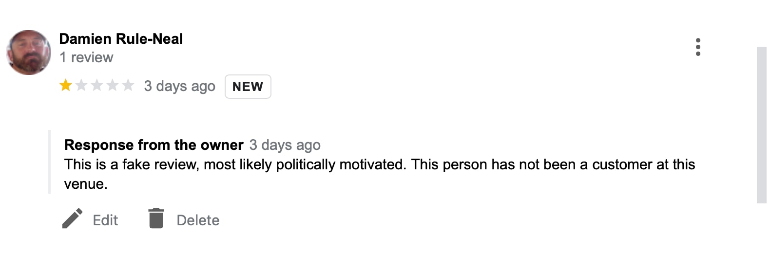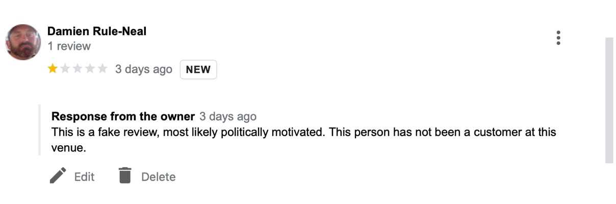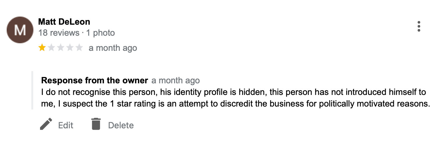 Right: Feb 2024. Recent Google “reviews” and my response. I have judged the “reviews” to be fake and attempts by “trans allies”/activists to downscore the business by exploiting the Google review system which does night require any evidence for the “reviewer” ever having set foot in the business space.