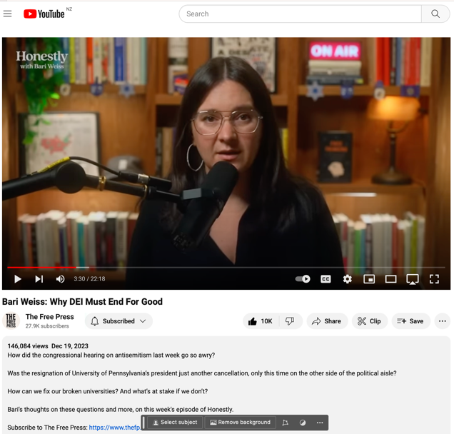 18min54sec. “The only solution is to dismantle the DEI regime that has enforced an illiberal worldview at nearly every American university. It is time to end DEI for good. No more standing by as people are encouraged to segregate themselves. No more forced declarations that you’re going to prioritise identity over excellence. No more compelled speech, no more going along with little lies for the sake of being polite. It’s time to stand up for what is right”