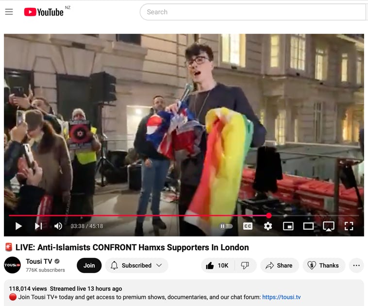 Left: Anti-Islamists CONFRONT Hamas Supporters In London on Tousi TV 11 March 2025. 32min45sec. A young member of the rainbow coalition wakes up to reality….“Our universities are supposed to teach us to tolerate, not hate….As a non-Jewish student I make my point very very clear. This is not about politics, nor is it about religion. It’s about standing for what’s right. And I will not stay silent. I will not stay silent when my Jewish brothers and sisters are under attack at university. We stand for what is right, and we want to defend our freedoms in this country and beyond. And they choose to call us fascists. I’m not Jewish, I’m not Israeli, and I’m also incredibly proud to be a queer man….I can go to Israel and marry whoever I like…the man of my dreams, the woman of my dreams, whoever I choose, and express my normal democratic freedoms like I do in this country…Am Israel Chai ”