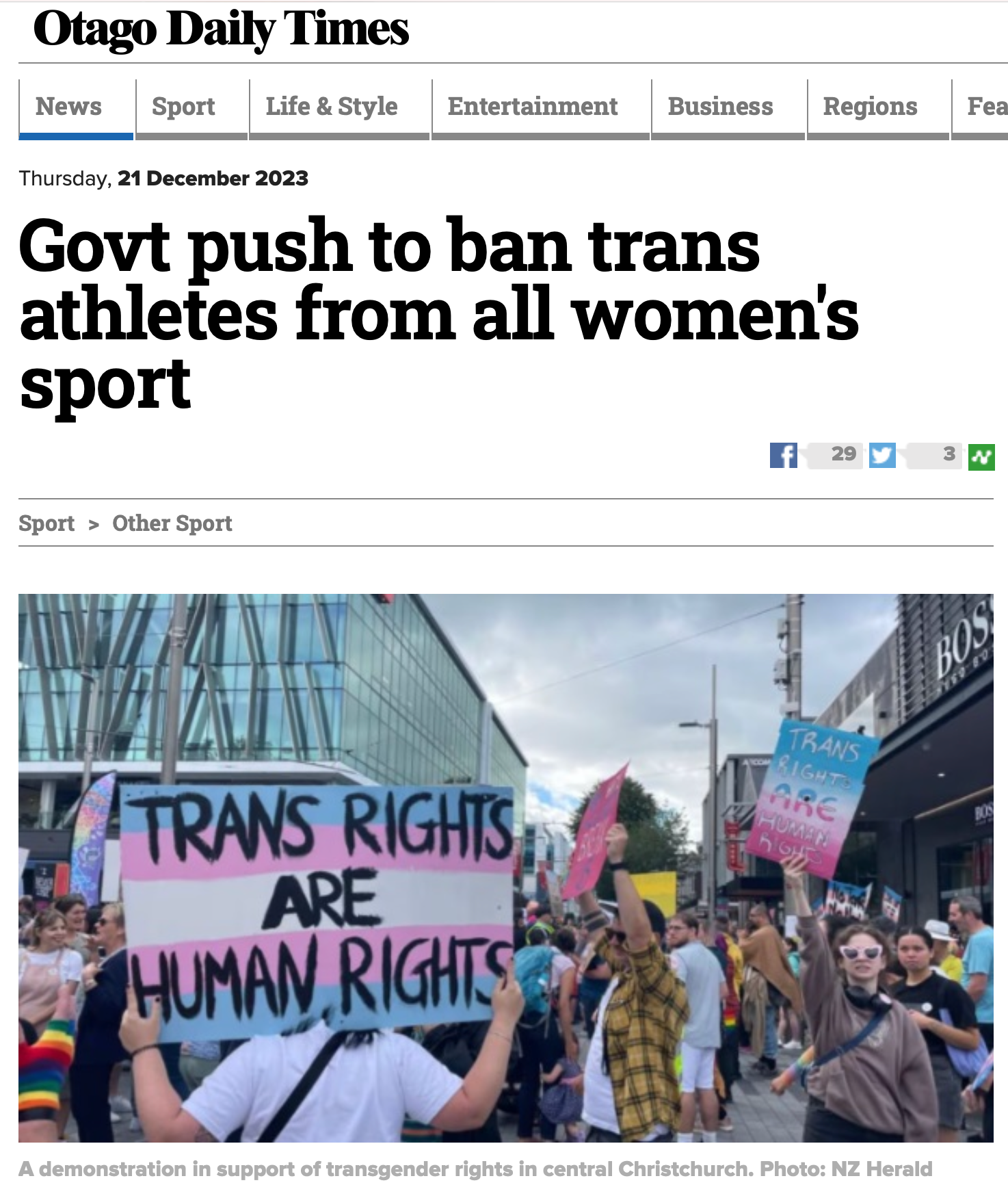 Above GOOD NEWS. 21 Dec 2023. ODT report: “Govt push to ban trans athletes from all women's sport”